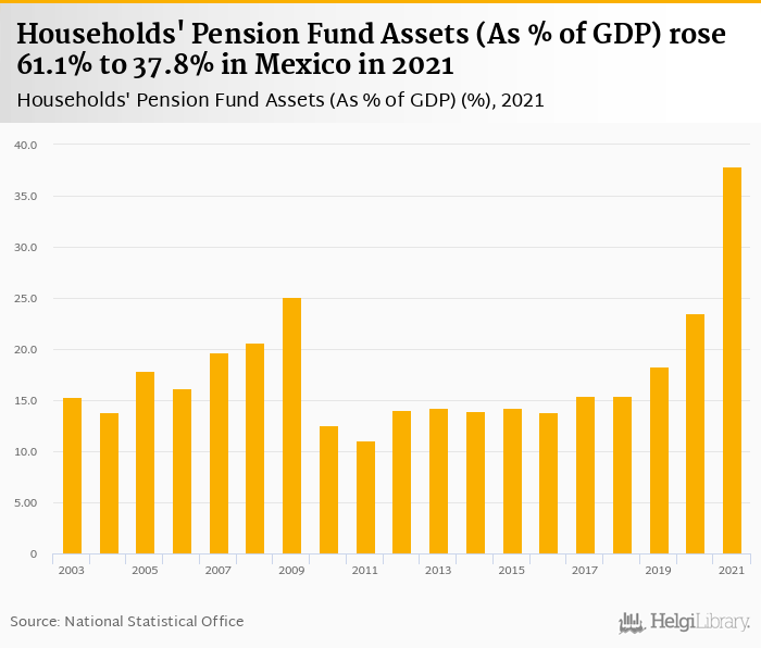 Households' pension fund assets as of GDP rose 61.1% to 37.8% in Mexico in 2021, according to OECD.