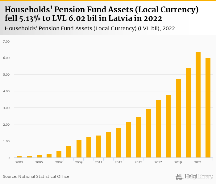 Households' pension fund assets fell 5.13% to LVL 6.02 bil in Latvia in 2022, according to OECD.