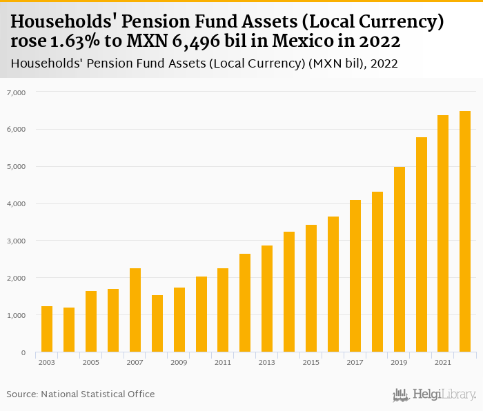 Households' pension fund assets rose 1.63% to MXN 6,496 bil in Mexico in 2022, according to OECD.