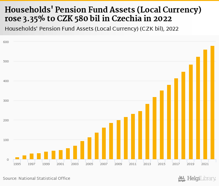 Households' pension fund assets rose 3.35% to CZK 580 bil in Czechia in 2022, according to OECD.