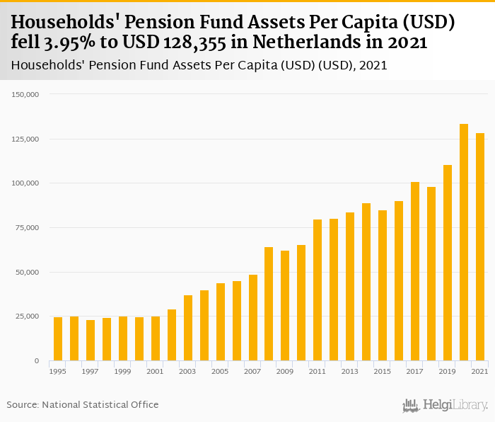 Households' pension fund assets per capita fell 3.95% to USD 128,355 in Netherlands in 2021, according to OECD.