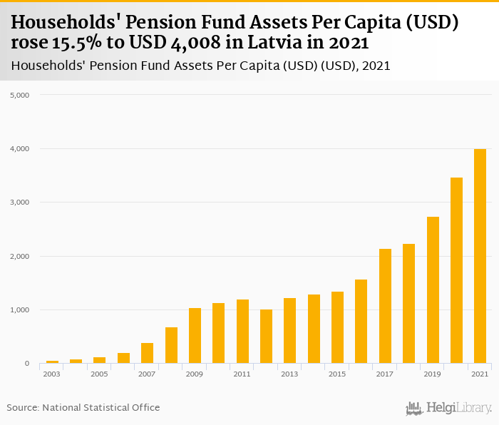 Households' pension fund assets per capita rose 15.5% to USD 4,008 in Latvia in 2021, according to OECD.