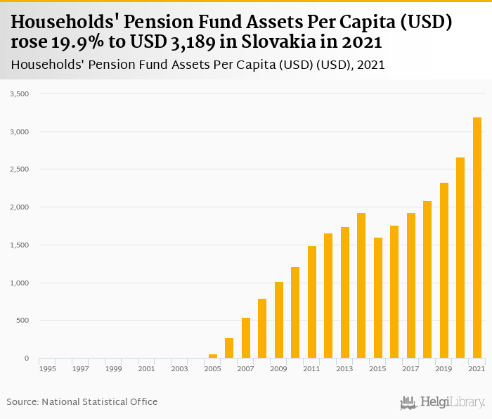 Households' pension fund assets per capita rose 19.9% to USD 3,189 in Slovakia in 2021, according to OECD.