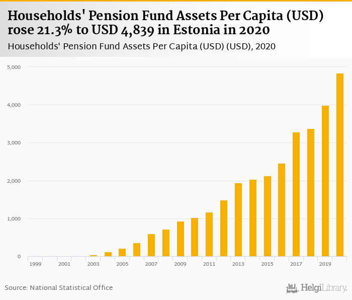 Households' pension fund assets per capita rose 21.3% to USD 4,839 in Estonia in 2020, according to OECD.