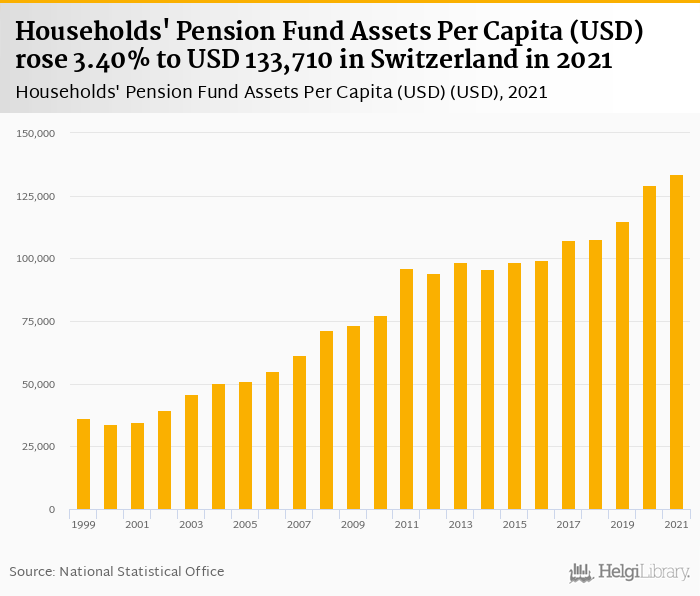 Households' pension fund assets per capita rose 3.40% to USD 133,710 in Switzerland in 2021, according to OECD.