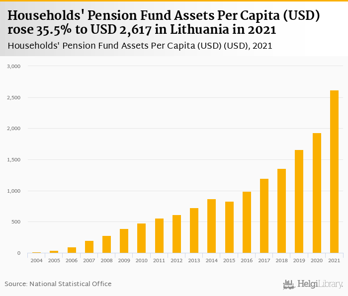 Households' pension fund assets per capita rose 35.5% to USD 2,617 in Lithuania in 2021, according to OECD.