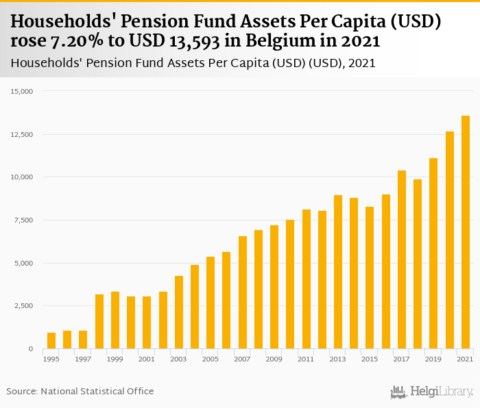 Households' pension fund assets per capita rose 7.20% to USD 13,593 in Belgium in 2021, according to OECD.
