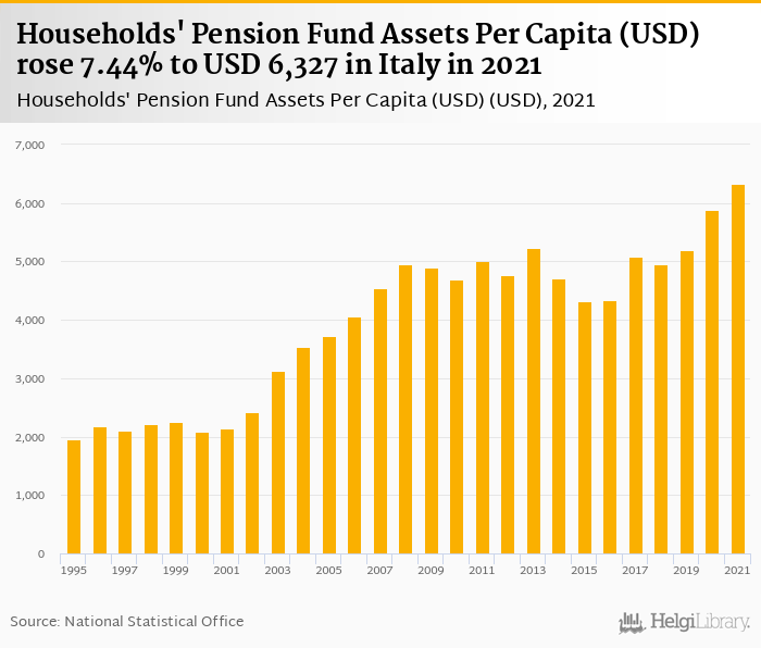 Households' pension fund assets per capita rose 7.44% to USD 6,327 in Italy in 2021, according to OECD.