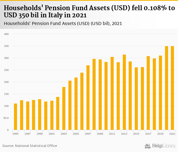 Households' pension fund assets fell 0.108% to USD 350 bil in Italy in 2021, according to OECD.
