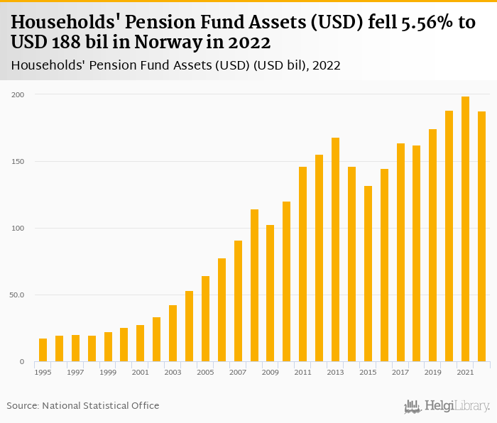 Historically, households' pension fund assets in Norway reached an all time high of USD 199 bil in 2021 and an all time low of USD 17.7 bil in 1995.