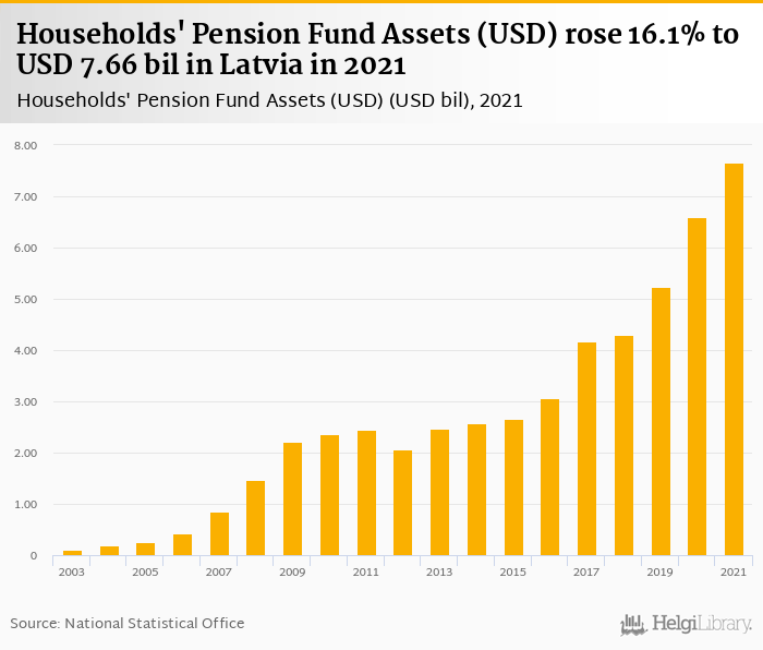 Households' pension fund assets rose 16.1% to USD 7.66 bil in Latvia in 2021, according to OECD.