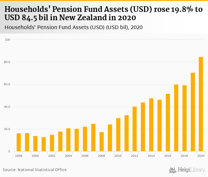 Households' pension fund assets rose 19.8% to USD 84.5 bil in New Zealand in 2020, according to OECD.