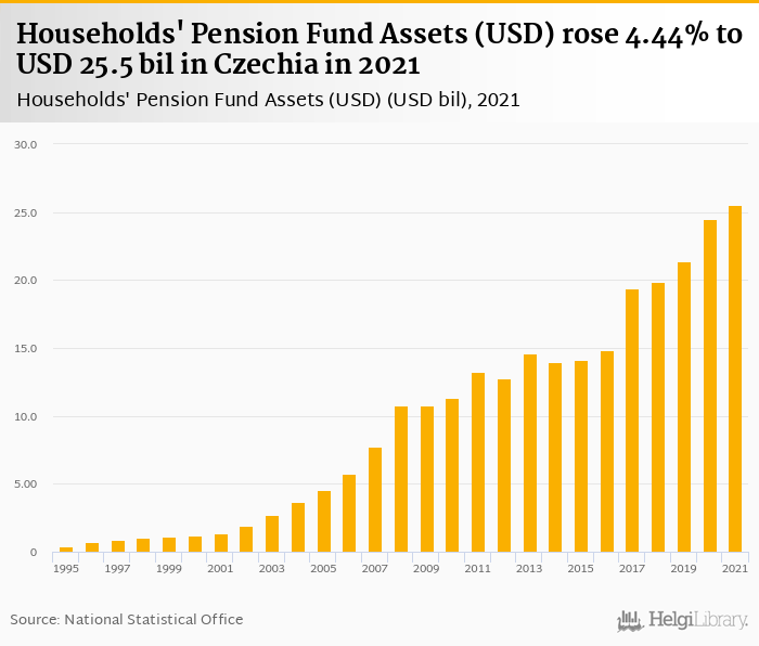 Households' pension fund assets rose 4.44% to USD 25.5 bil in Czechia in 2021, according to OECD.