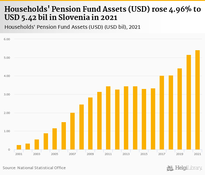 Households' pension fund assets rose 4.96% to USD 5.42 bil in Slovenia in 2021, according to OECD.