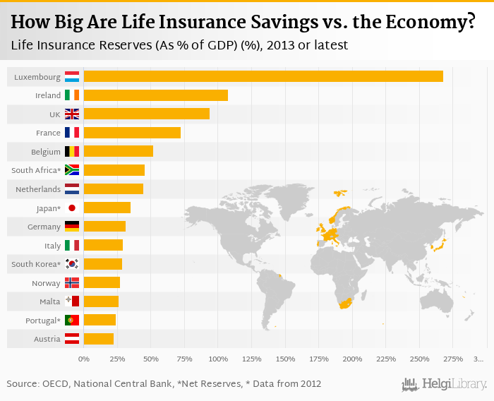Based on a comparison of 54 countries in 2013, Luxembourg ranked the highest in life insurance reserves as a percentage of GDP with 268% followed by Ireland and United Kingdom. On the other end of the scale was India with 0.002%, Venezuela with 0.016% and Georgia with 0.057%.