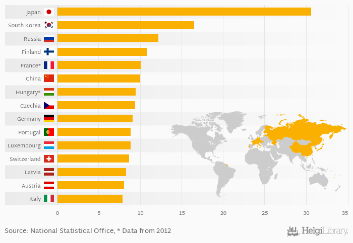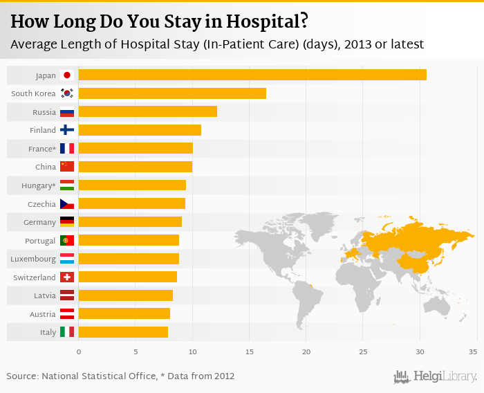 Based on a comparison of 37 countries in 2013, Japan ranked the highest in average length of hospital stay for in-patient care with 30.6 days followed by South Korea and Russia. On the other end of the scale was Turkey with 3.90 days, Mexico with 4.00 days and Denmark with 4.30 days.