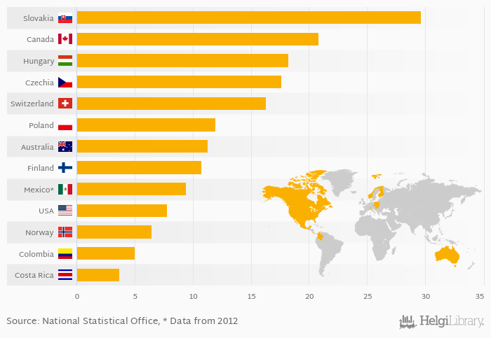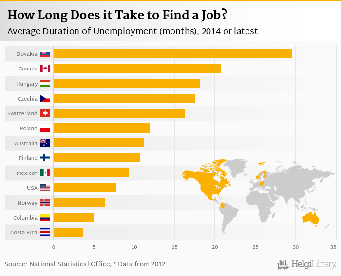 Based on a comparison of 13 countries in 2014, Slovakia ranked the highest in Average Duration of Unemployment with 29.6 months followed by Canada and Hungary. On the other end of the scale was Costa Rica with 3.67 months, Colombia with 5.03 months and Norway with 6.45 months.