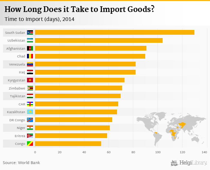 Based on a comparison of 170 countries in 2014, South Sudan ranked the highest in time to import with 130 days followed by Uzbekistan and Afghanistan. On the other end of the scale was Singapore with 4.00 days, Cyprus with 5.00 days and Hong Kong with 5.00 days.