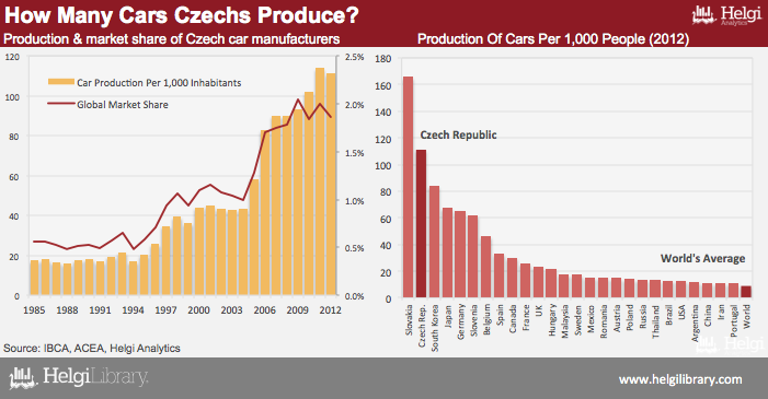 The Czech Republic (together with Slovakia, the other half of former Czechoslovakia until 1992) has become the "Detroit of Europe" over the last decade. Both countries produce the most cars per capita in the world, over 100 cars per 1,000 inhabitants.