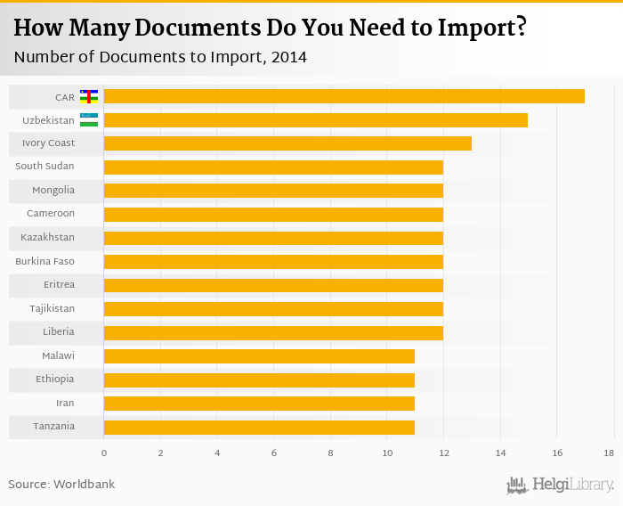 Based on a comparison of 170 countries in 2014, Central African Republic ranked the highest in documents to import with 17.0 followed by Uzbekistan and Ivory Coast. On the other end of the scale was France with 2.00, Ireland with 2.00 and China with 2.80.