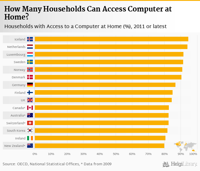 Based on a comparison of 40 countries in 2011, Iceland ranked the highest in households with access to a computer at home with 94.7% followed by Netherlands and Luxembourg. On the other end of the scale was India with 6.90%, Indonesia with 12.0% and South Africa with 19.5%.