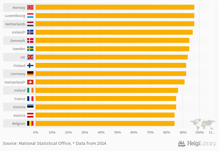 | Norway | % | ... | ... | ... | ... | ... | ... | ... | 90.0% | 92.0% | 93.0% | 94.0% | 93.0% | |||||||||