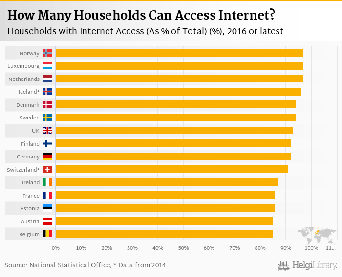 Based on a comparison of 33 countries in 2016, Norway ranked the highest in Households with Internet Access (As % of Total) with 97.0% followed by Luxembourg and Netherlands. On the other end of the scale was Serbia with 64.0%, Bulgaria with 64.0% and Lithuania with 72.0%.
