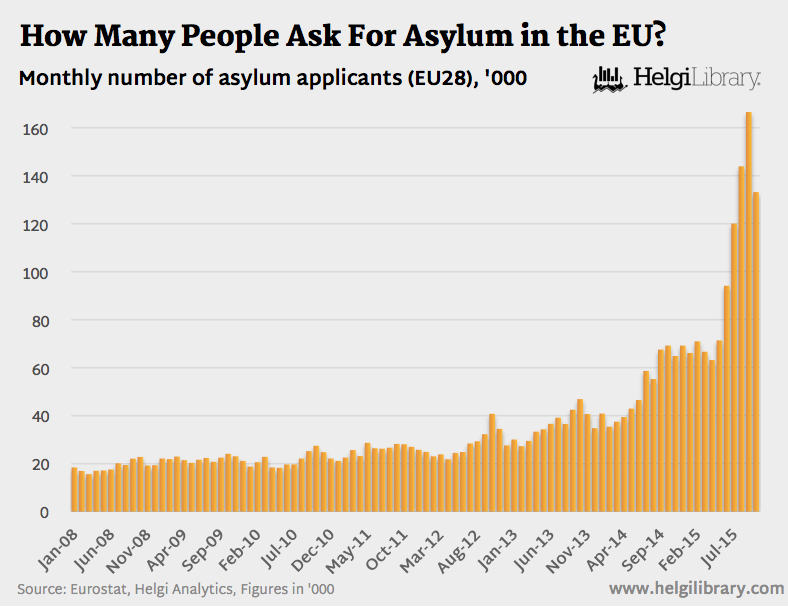With over a million people asking for asylum already within the first 11 months of 2015, the European Union faces an unprecedented problem with a numbers of refugees streaming across its borders and try to keep more from coming. The actual numbers are significantly higher than the above figures since the Eurostat data only count people who have formally applied for asylum.