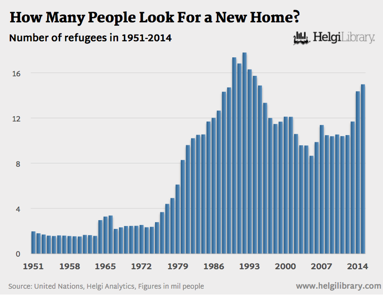 The global refugee total, which a year ago was 19.5 million, had as of mid-2015 passed the 20 million threshold for the first time since 1992. Asylum applications meanwhile were up 78% over the same period in 2014. And the numbers of internally displaced people jumped by around 2 million to an estimated 34 million.