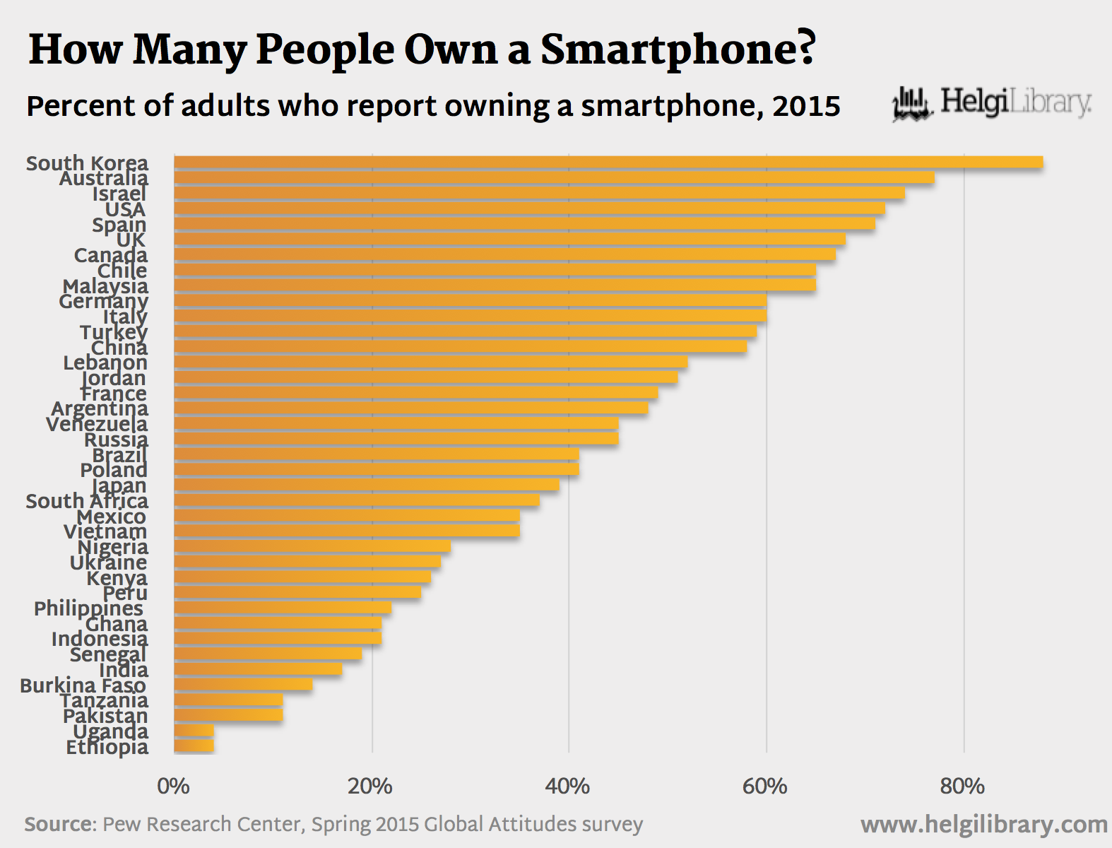 But smartphone ownership rates in emerging and developing nations are rising at an extraordinary rate, climbing from a median of 21% in 2013 to 37% in 2015. That’s nearly a doubling of the smartphone penetration rate during that two-year period.