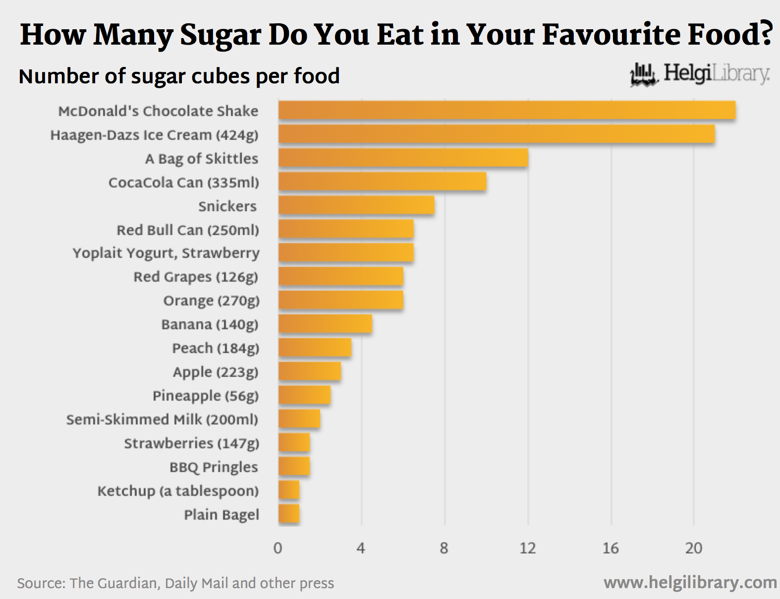 We've used regular sugar cubes (4 grams of sugar each) to give you an idea about both the obvious and the hidden sweets in your favourite foods. We aren't differentiating between types of sugar - i.e, sucrose, corn syrup, honey, fructose, cane sugar etc. Some are better, some worse and of course there is a differences in how these are metabolized.