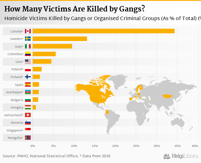Based on a comparison of 14 countries in 2012, Canada ranked the highest in homicide victims killed by gangs or organised criminal groups as a share of total victims with 34.4% followed by Sweden and Singapore. On the other end of the scale was Hungary with 0.800%, Bulgaria with 1.40% and Azerbaijan with 1.50%.