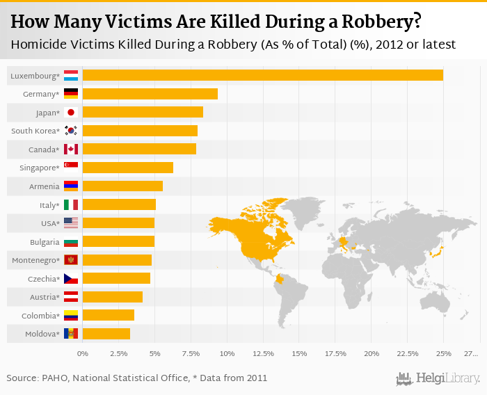 Based on a comparison of 24 countries in 2012, Luxembourg ranked the highest in homicide victims killed during a robbery as a share of total victims with 25.0% followed by Germany and Japan. On the other end of the scale was Georgia with 0.500%, Mongolia with 0.800% and Finland with 1.80%.