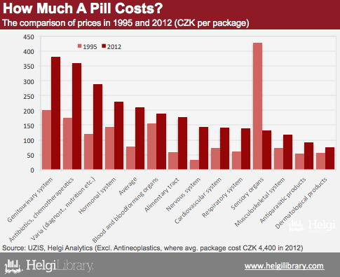 Prices per package have doubled since 1999 to CZK 209 per pack in 2012. Prices for Antineoplastics and drugs for nervous system have increased the most