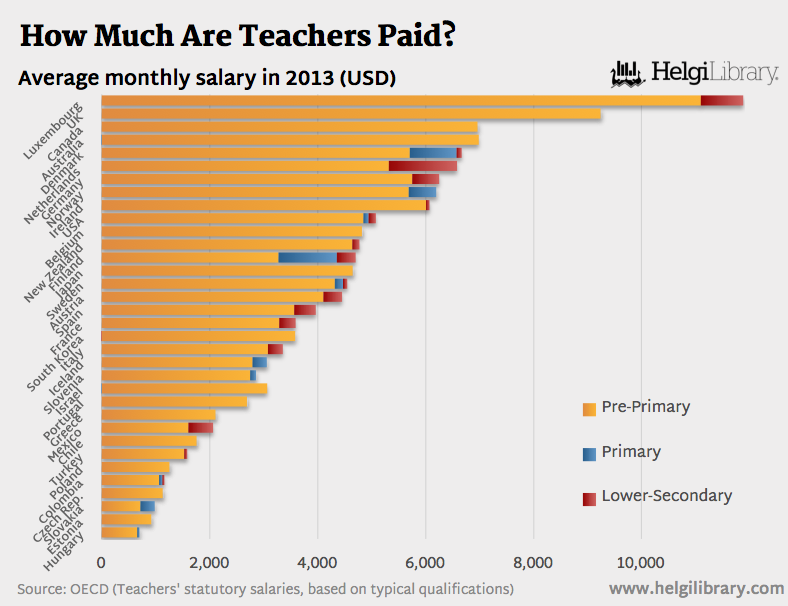 But, teachers’ salaries vary widely across countries, according to OECD. The salaries of lower secondary school teachers with 15 years of experience range from less than USD 15,000 in Estonia, Hungary, Indonesia and the Slovak Republic, to more than USD 60,000 in Germany, the Netherlands and Switzerland and exceed USD 100,000 in Luxembourg.