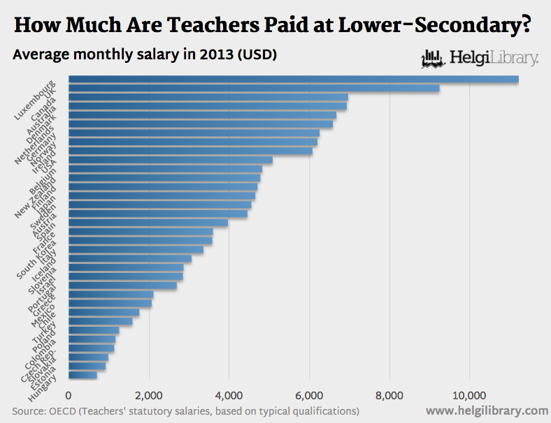 But, teachers’ salaries vary widely across countries, according to OECD. The salaries of lower secondary school teachers with 15 years of experience range from less than USD 15,000 in Estonia, Hungary, Indonesia and the Slovak Republic, to more than USD 60,000 in Germany, the Netherlands and Switzerland and exceed USD 100,000 in Luxembourg.