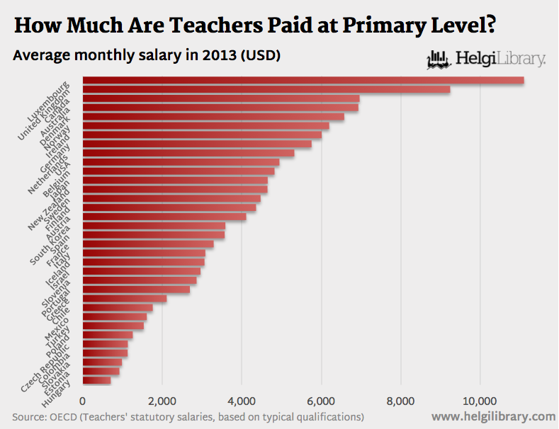 But, teachers’ salaries vary widely across countries, according to OECD. The salaries of lower secondary school teachers with 15 years of experience range from less than USD 15,000 in Estonia, Hungary, Indonesia and the Slovak Republic, to more than USD 60,000 in Germany, the Netherlands and Switzerland and exceed USD 100,000 in Luxembourg.