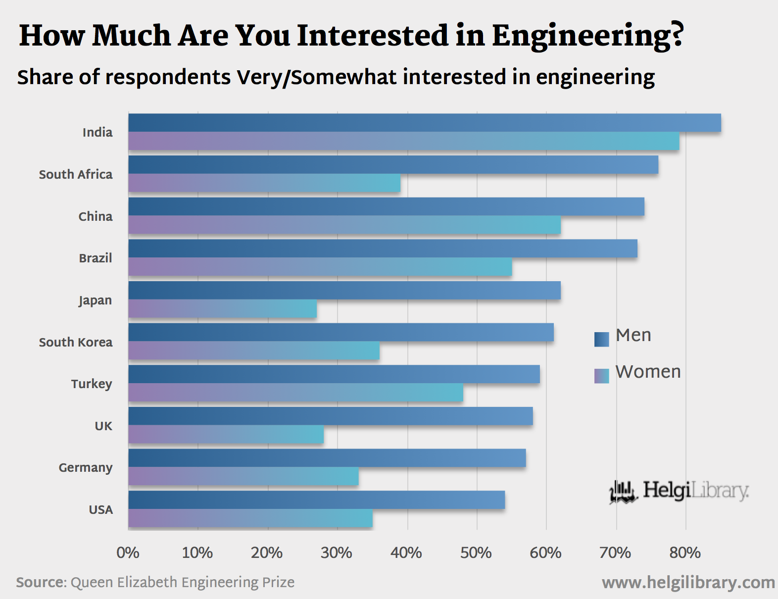 In countries that have recently experienced economic growth, the profession holds huge attraction for the next generation. For example, in both India and Turkey, around 80 per cent of 16 to 17-year-olds say they are interested in engineering. However, that figure drops to just 20 per cent in the UK, where interest is greatest among those aged 45 and over.