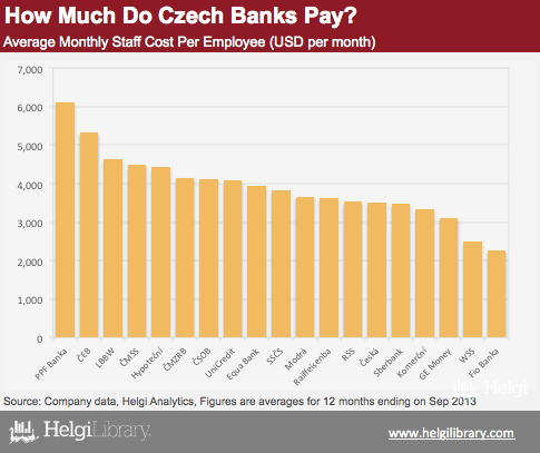 In terms of average staff cost, PPF Banka, an investment arm of the PPF Group paid over USD 6,000 per employee a month at the end of September 2013, twice as much as GE Money Bank or Komercni Banka, for example.