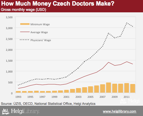 Czech physician earned USD 30,144 in 2011 on average, according to the data provided by UZIS. If true, this would imply 2.3x multiple over the average salary in the country, in line with Denmark, or Israel.