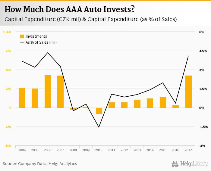 AAA Auto invested a total of CZK 426 mil in 2017, up 1% compared to the previous year. Historically, between 2004 - 2017, the company's investments stood at a high of CZK 428 mil in 2006 and a low of CZK -80.5 mil in 2010.