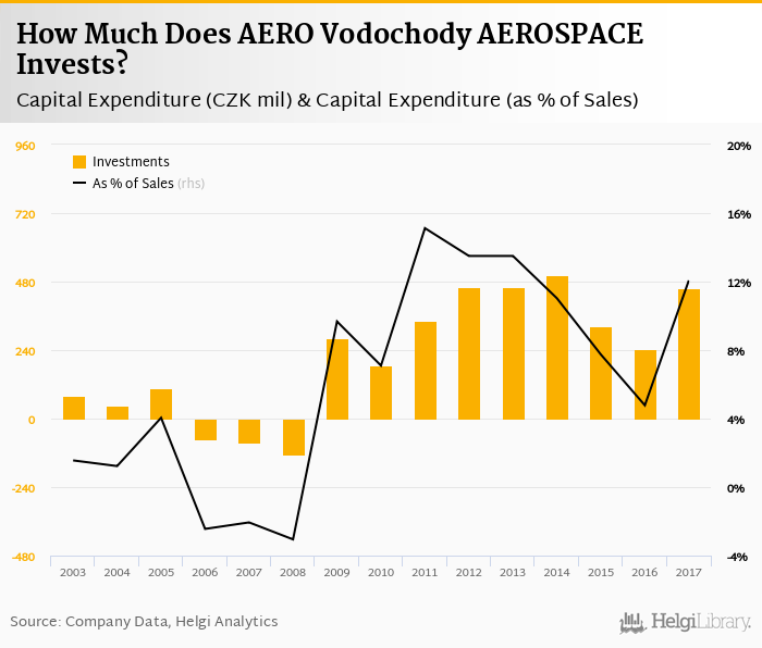AERO Vodochody AEROSPACE invested a total of CZK 457 mil in 2017, up 87.7% compared to the previous year. Historically, between 2003 - 2017, the company's investments stood at a high of CZK 502 mil in 2014 and a low of CZK -126 mil in 2008.