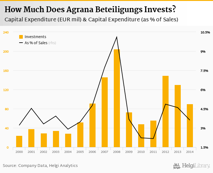Agrana Beteiligungs invested a total of EUR 89.9 mil in 2014, down 31.1% compared to the previous year. Historically, between 2000 - 2014, the company's investments stood at a high of EUR 205 mil in 2008 and a low of EUR 24.4 mil in 2000.