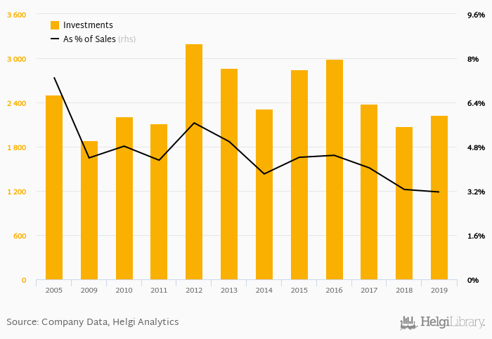 As a percentage of total sales, investments stood at 3.16% in 2019, down from 3.25% as seen in the previous year. This is compared to an average of 3.87% over the last five years.