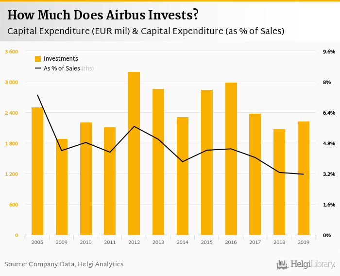 Airbus invested a total of EUR 2,228 mil in 2019, up 7.53% compared to the previous year. Historically, between 2005 - 2019, the company's investments stood at a high of EUR 3,197 mil in 2012 and a low of EUR 1,882 mil in 2009.