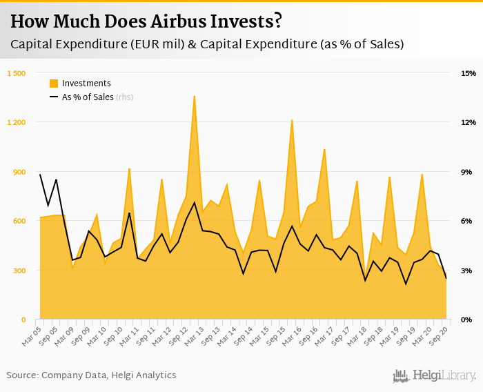Airbus invested a total of EUR 273 mil in 3Q2020, down 48% compared to the previous year. Historically, between 1Q2005 - 3Q2020, the company's investments stood at a high of EUR 1,358 mil in 4Q2012 and a low of EUR 237 mil in 1Q2018.