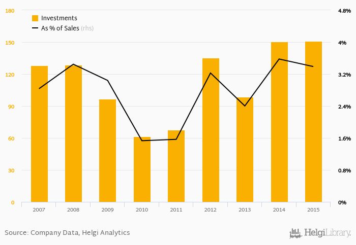 As a percentage of total sales, investments stood at 3.39% in 2015, down from 3.58% as seen in the previous year. This is compared to an average of 2.83% over the last five years.