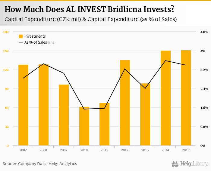 AL INVEST Bridlicna invested a total of CZK 151 mil in 2015, up 0.139% compared to the previous year. Historically, between 2007 - 2015, the company's investments stood at a high of CZK 151 mil in 2015 and a low of CZK 61.7 mil in 2010.