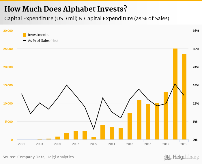 Alphabet invested a total of USD 23,548 mil in 2019, down 5.96% compared to the previous year. Historically, between 2001 - 2019, the company's investments stood at a high of USD 25,041 mil in 2018 and a low of USD 13.1 mil in 2001.