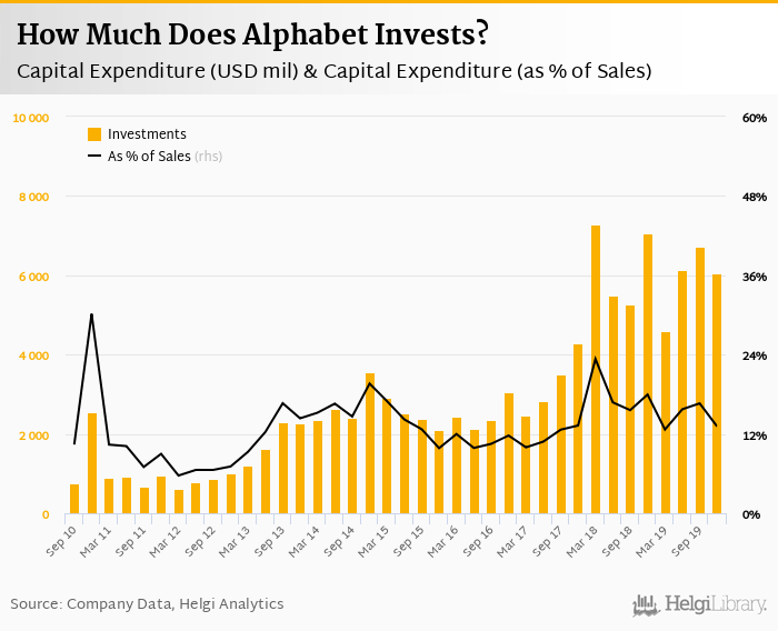 Alphabet invested a total of USD 6,052 mil in 4Q2019, down 14.2% compared to the previous year. Historically, between 1Q2010 - 4Q2019, the company's investments stood at a high of USD 7,269 mil in 1Q2018 and a low of USD 239 mil in 1Q2010.